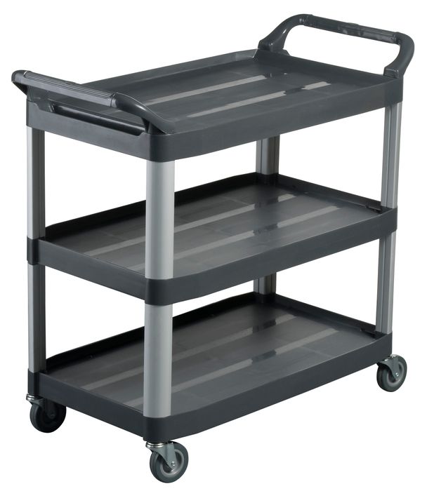 Heavy duty black plastic utility cart with 3 shelves. It's features include:
