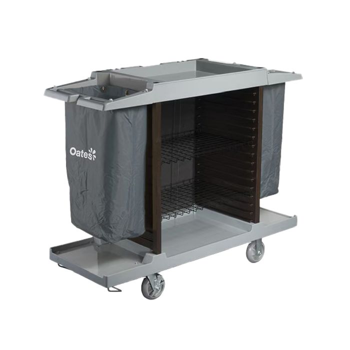 This room service cart allows for the easy collection of used linen, or the storage for fresh linen. It includes shelves for cleaning items and/or replenishment items.
