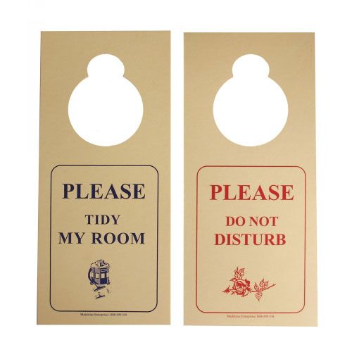 Cardboard door sign to hang on door knob. Reversable sides which read 'Please do not disturb' and 'Please tidy my room'.