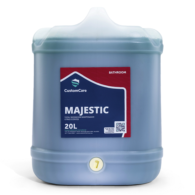 Majestic's clinging action, coupled with its natural orange oil and pine oil solvents, makes it the ideal product for bathroom use. It easy removes grease, body fats, soap scum and hard water scale and stains. It is a strong detergent that is perfect for use on Toilets, Urinals, Showers, Baths, Glass Screens, Benchtops, Walls, Sinks, Taps and Floors. It is Non-toxic, Non-corrosive and Phosphate Free.
