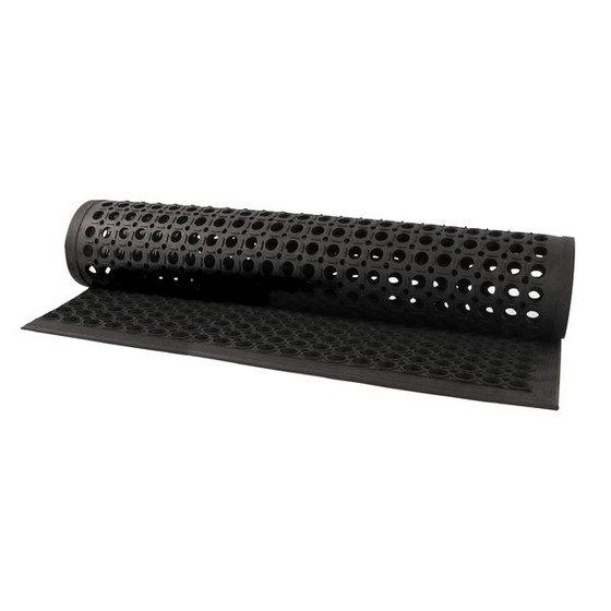 A heavy duty, black rubber mat suited to the outdoors but also can be used indoor environment. These can be used in commercial kitchens, behind bars, and even around coffee machines. The rubber matting is designed so that liquid and food, as well as dirt can fall through the holes as opposed to it slipping underneath. The 15mm thick rubber offers excellent cushion so that fatigue does not occur in the feet and legs when standing for prolonged periods.