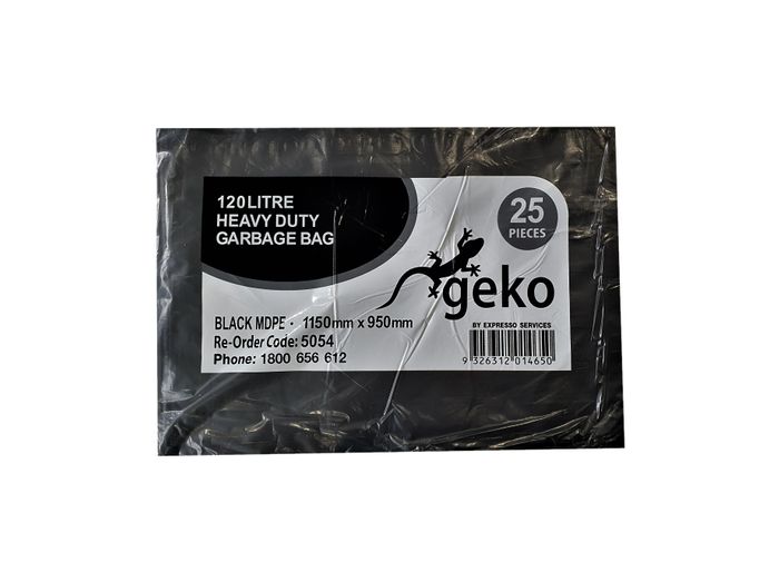 Expresso's own premium brand of Geko Bin Bags. Heavy duty 120L black garbage bags in a flatpack. Capable of carrying heavy loads, these bin liners are ideal for general waste in hotels, food-service areas etc.