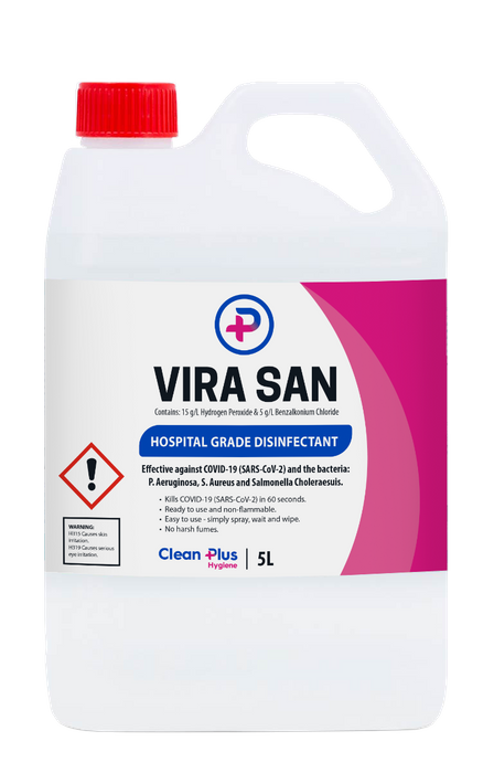 VIRA SAN is a Hospital Grade and Food Safe disinfectant. Linking the power of Hydrogen Peroxide and Benzalkonium Chloride, VIRA SAN works by deactivating COVID-19 at the core in 60 seconds. The synergy between these compounds allows for optimal perfomance by initiating a quick removal of these threats and creating a film to ensure prolonged protection of surfaces.