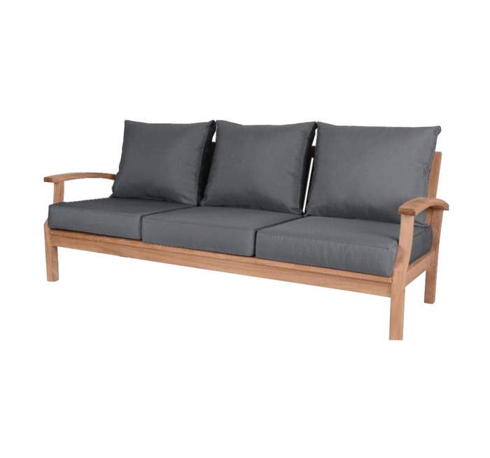 Deep 3 Seater outdoor lounge with cushions. The Teak Collection consists of a smooth finish and perfectly curved arches. This outdoor sofa is super comfy and is designed and created for smart and simple outdoor spaces.