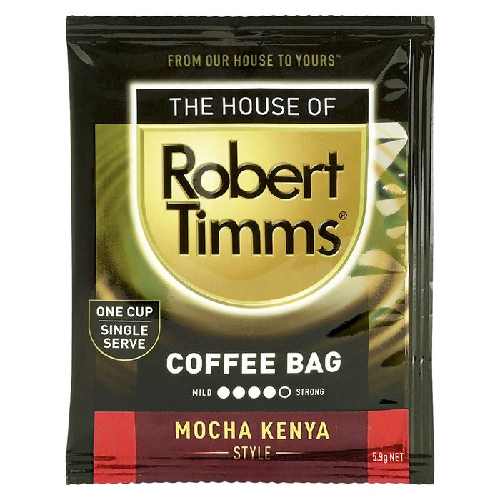 Robert Timms quality coffee bags individually sealed for both freshness and ease of use. Mocha Kenya stlye is a full body with a deep chocolate and nutty flavour. The mocha and kenya beans are blended together and medium roasted to produce a rich, smooth flavour with a sweet acidity and rich aroma.