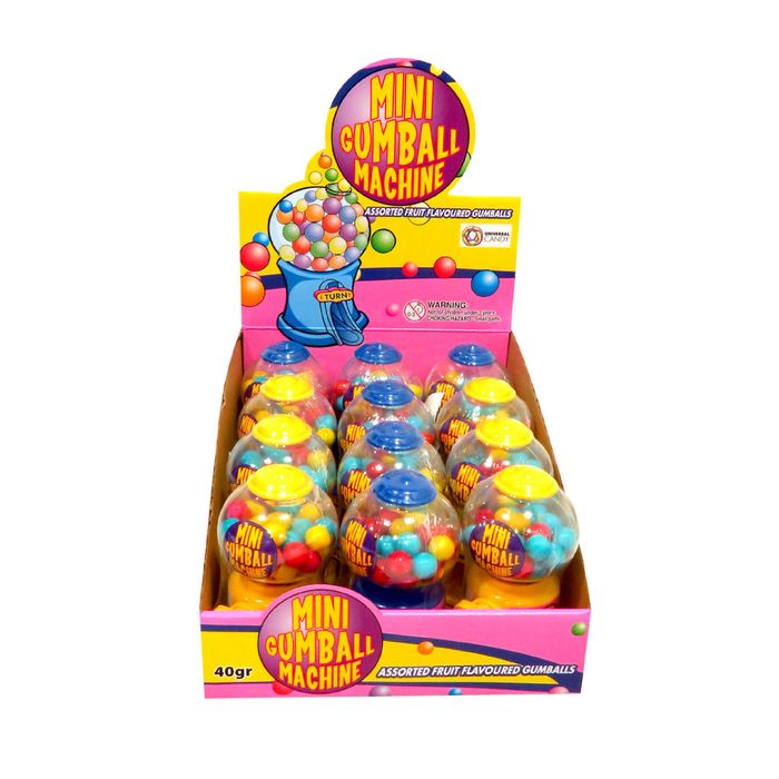 Mini Gumball Machines with assorted fruit flavoured gum balls inside.