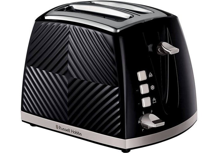 This 2 Slice toaster has a textured diamond design with chrome accents. It features extra wide slots, defrost, reheat and cancel functions and a high lift mechanism.