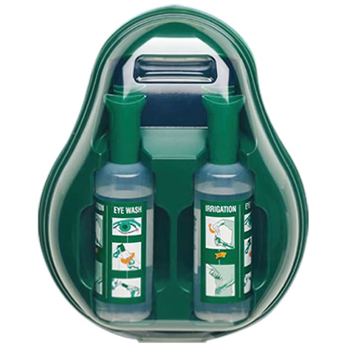 This eyewash station has a drop down dust cover, integrated mirror, integrated eye cup and a secure safety seal. The solution isnside the 500ml bottles is made up strictly of Sodium Chloride 0.9% sterile solution which is safe and cleansing for eyes and wounds.