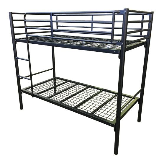 Commercial hand fabricated steel bunk bed frame with a taper fit locking system and welded mesh bases.